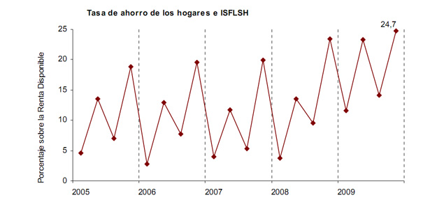 Por contra, el ahorro de la sociedad, como refleja este gráfico aportado por RTVE, no ha crecido a un ritmo constante. Las diferentes líneas de tendencia entre el crecimiento del crédito y el consumo indican una crisis económica. Como vemos, las observaciones empíricas coinciden con la teoría austríaca del ciclo económico.