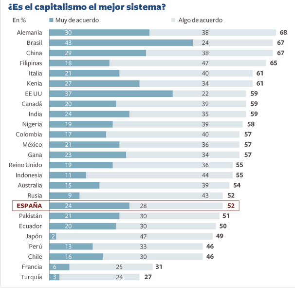 No todo el mundo ve claros los beneficios del capitalismo. Por ejemplo, algunos periodistas estadounidenses de la BBC acusan a Ron Paul de ser un aislacionista por defender la no intervención militar en otros países. Sin embargo, Ron Paul es un gran defensor del libre mercado que es el bastión de la unión de civilizaciones. La globalización ha sido consecuencia de ello. Otro ejemplo es el gran número de personas imbuidas en la creencia popular de que los paises rivalizan entre sí con sus economías. En tiempos de nacionalismo económico sí había rivalidad, pero en tiempo de globalización y comercio internacional la caída de un país repercute negativamente a todo el mundo. Según una encuesta a la que ha tenido acceso el diario El país, este es el porcentaje de personas que se muestran a favor del capitalismo: