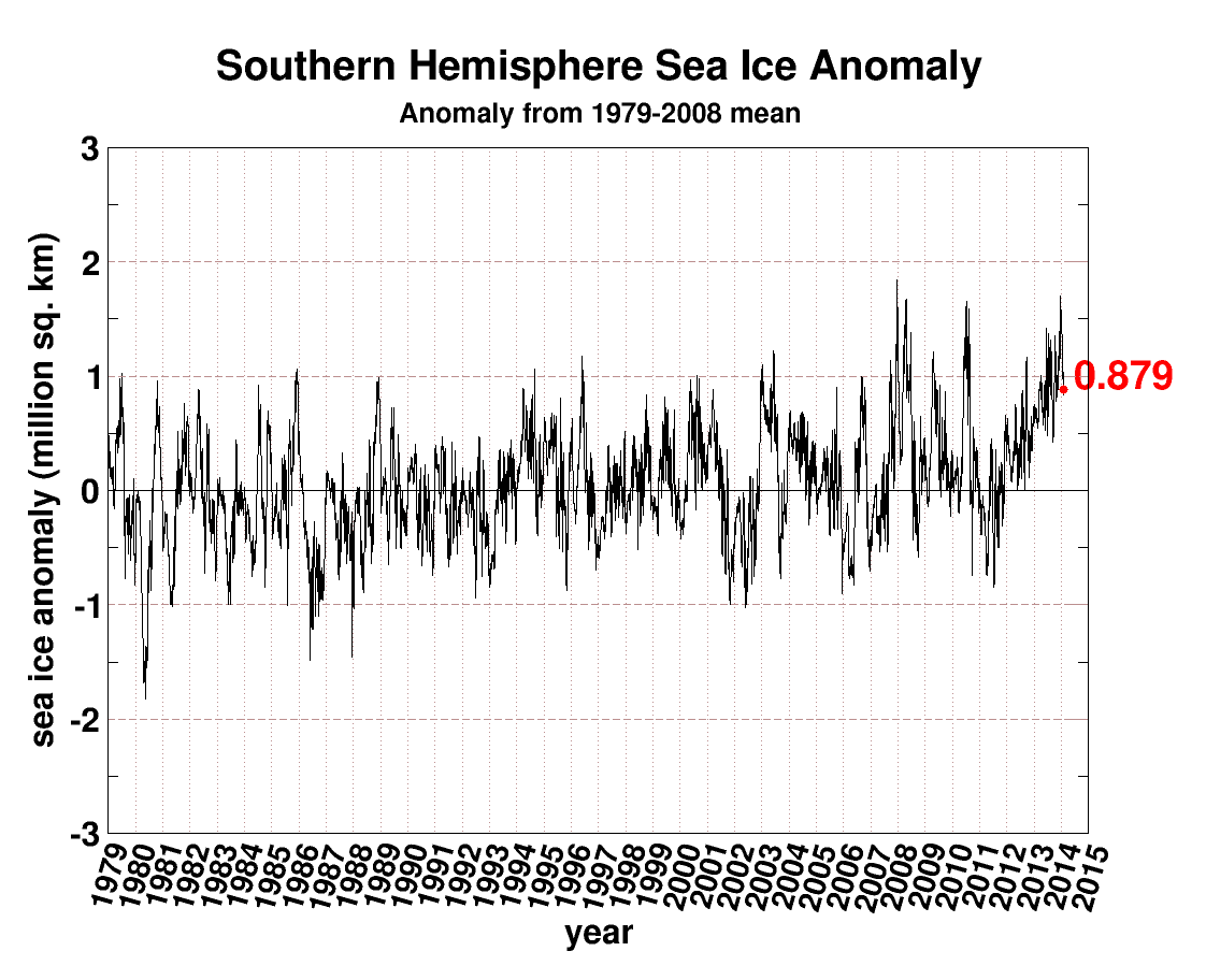 Un apunte que los alarmistas siempre “olvidan” cuando hablan del deshielo del polo norte (Ártico), es que viene acompañado por un continuo aumento en el polo sur (Antártico). Y cuando no lo olvidan, tienen preparada su tabla de excusas que incluye el agujero local de ozono, cambios en la circulación oceánica… y cualquier cosa menos aceptar que la alta variabilidad de las zonas polares no es la excepción, sino que es más bien la norma, con o sin CO2, con o sin humanos.