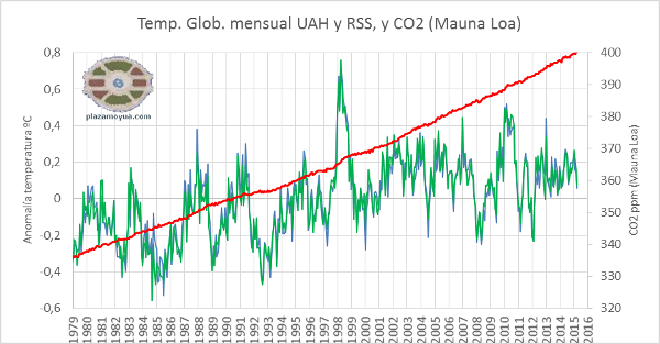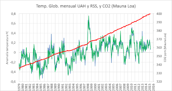 Hay representadas dos series diferentes de temperatura global medida desde satélites. De dos equipos muy, muy independientes. «Ideológicamente» contrarios (alarmistas / escépticos), y usando procedimientos francamente distintos para capturar la señal de temperatura a partir del «brillo» del CO2 del aire. Una tiene la línea de datos en verde, y la otra en azul. Pero apenas se ve el azul, porque el verde va encima y la coincidencia es inmejorable.