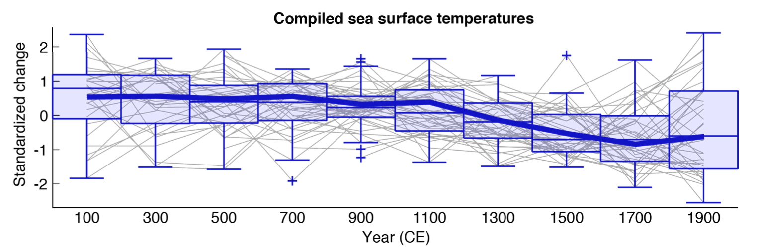 Ya resulta muy llamativo el gráfico principal del estudio. Donde no hay cristiano que pueda ver ningún efecto profundo del hombre moderno pecador sobre esa serie de supuesta temperatura del mar global. Y mucho menos un calentamiento unas veinte veces más rápido que el enfriamiento anterior.