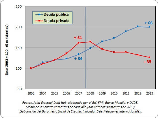 1.- España, que el año anterior se había endeudado con el extranjero en casi 100.000 M€, ya no podría seguir endeudándose al mismo ritmo. Eso crearía una falta de demanda que sólo podía solucionarse con una bajada de salarios y precios.