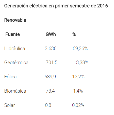 Es cierto que un altísimo porcentaje de la generación eléctrica es producida por renovables (concretamente un 96,36% en el primer semestre de 2016 según datos de la Presidencia de Costa Rica). Lo que mucha gente olvida es el problema del factor de utilización de las energías renovables y su dependencia de condiciones ambientales (como las horas de luz o el nivel de precipitaciones). En la siguiente tabla podemos ver la distribución de la generación eléctrica de Costa Rica en el primer semestre de 2016. Cabría suponer que una temporada de lluvias abundantes tendría una influencia directa en la cantidad de energía hidráulica generada, nada menos que un 69,36 % del total de la energía eléctrica producida.