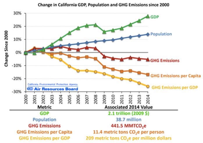 The chart shows a decline in GHG intensity of the economy of 26% between 2000 and 2014; this is equivalent to an increase in efficiency of 35% (because 1 / 0.76 = 1.35). Over 14 years, this is a compound improvement of 2.2% a year. You know what I’m about to say: the United States as a whole did slightly better! Though, to be fair, an apples-to-apples comparison would involve only CO2 emissions, rather than all GHGs. But you get the point: California has done no better than the US when it comes to decarbonizing its economy. And, as noted before, the US has had that rate of decarbonization (or a similar one) for decades.