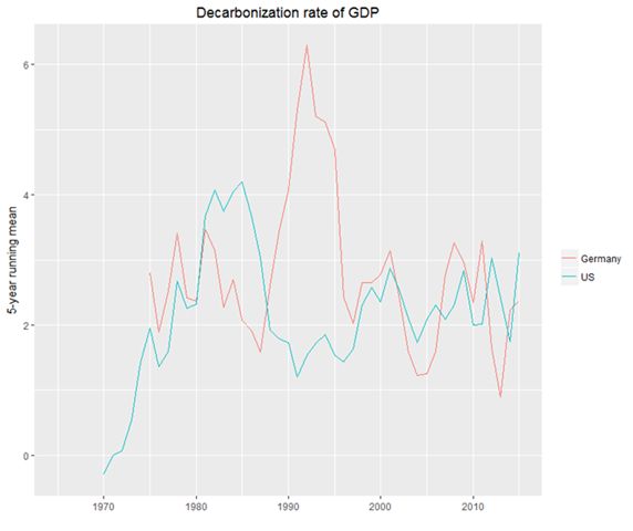Yes, emissions used to go up and now they go down because GDP used to go up more than it does now. There has been some increase in the decarbonization rate of the US, but not a lot; most the decline in emissions has come from slower GDP growth.