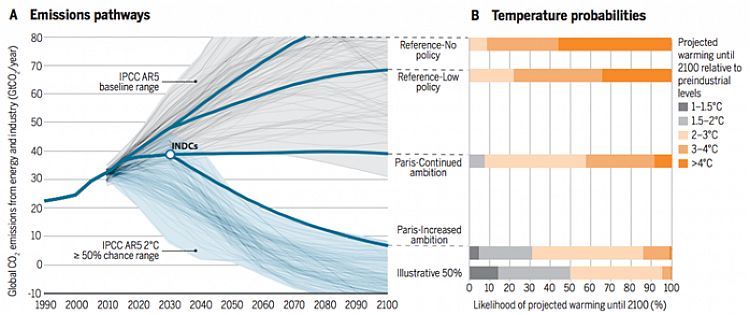 En efecto, ese artículo asegura que el no hacer nada lleva a un calentamiento (respecto a la era preindustrial, que se suele considerar la media de 1850-1900) de 2,8ºC en el caso de seguir el acuerdo de París, y de 4,3ºC en el caso de no hacer nada.