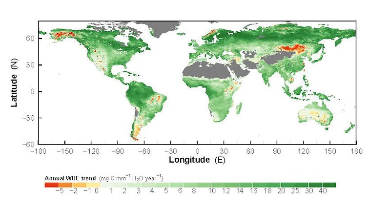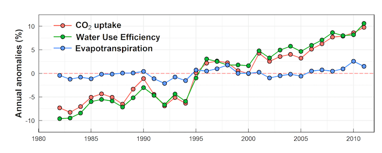 Una de esas adaptaciones es cerrar los estomas ligeramente, para dejar entrar el CO2 con menos agua escapando fuera. Con un aumento del CO2, el resultado total es que la toma de carbono aumenta sin aumentar el consumo de agua. Esto es exactamente lo que hemos encontrado a una escala global en nuestro nuevo estudio. De hecho, hemos encontrado que el aumento del CO2 está causando que las plantas sean más eficientes en el uso del agua, casi en todas partes, tanto en lugares secos como húmedos.